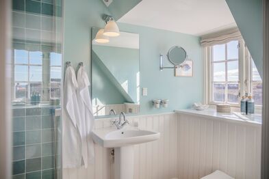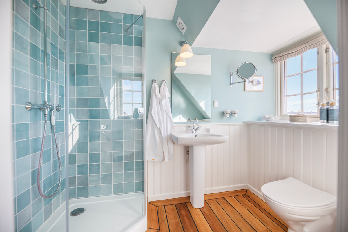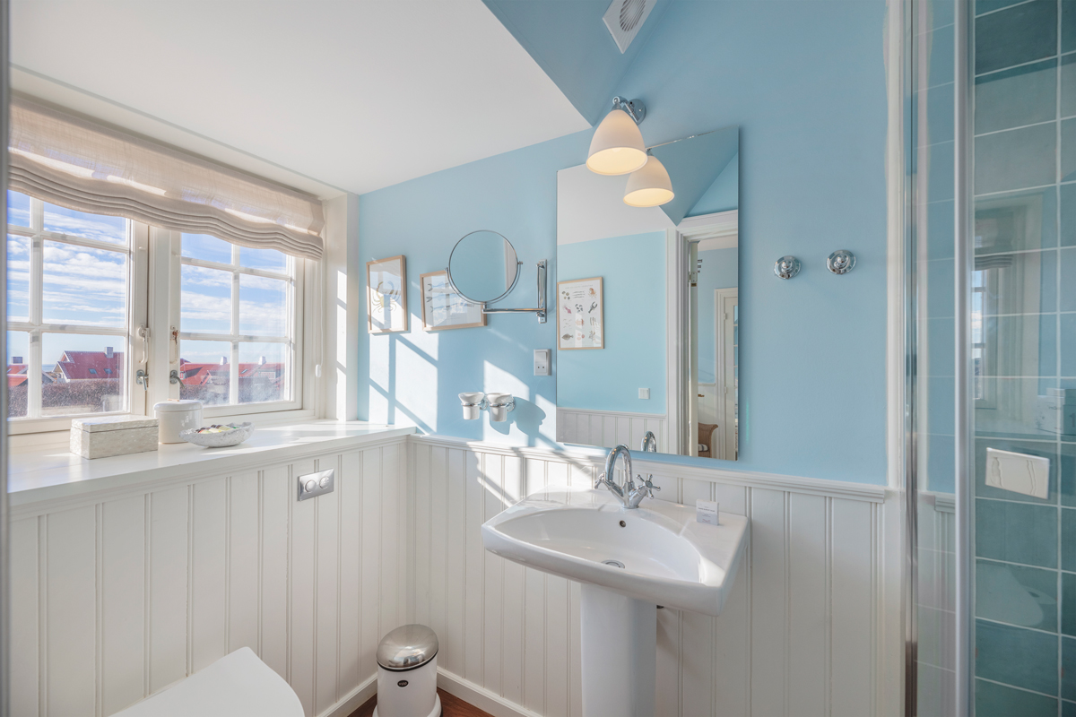 På badeværelserne indgår træpaneler samt de udvalgte nuancer på væggene i et elegant sammenspil med mere moderne klinker såvel som de øvrige faciliteter.