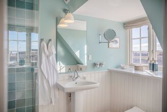Værelserne er blevet totalrenoveret. Alt fra klinkerne på badeværelset og farven på væggene til gardiner, møblement og det øvrige interiør.