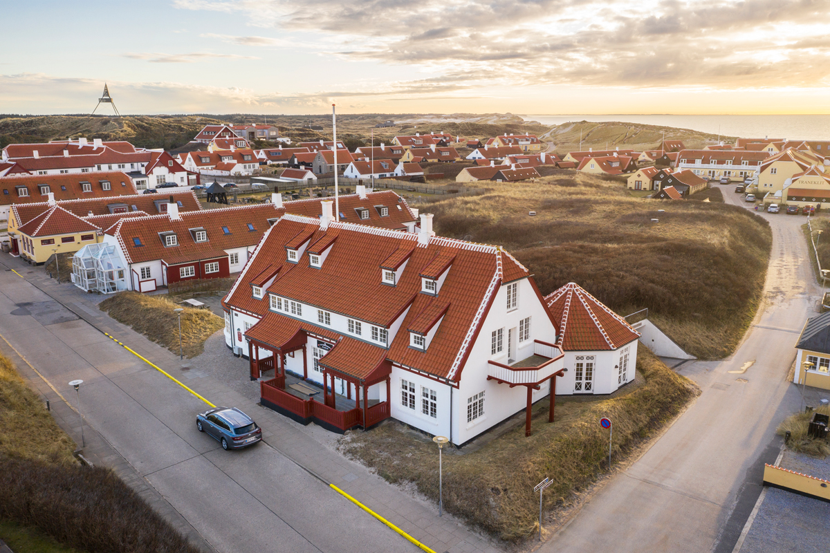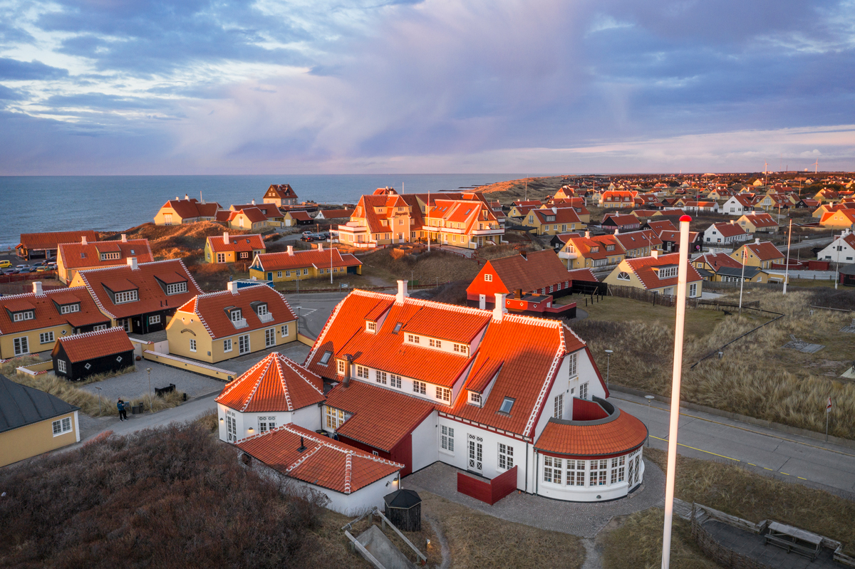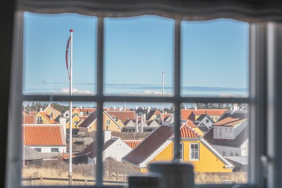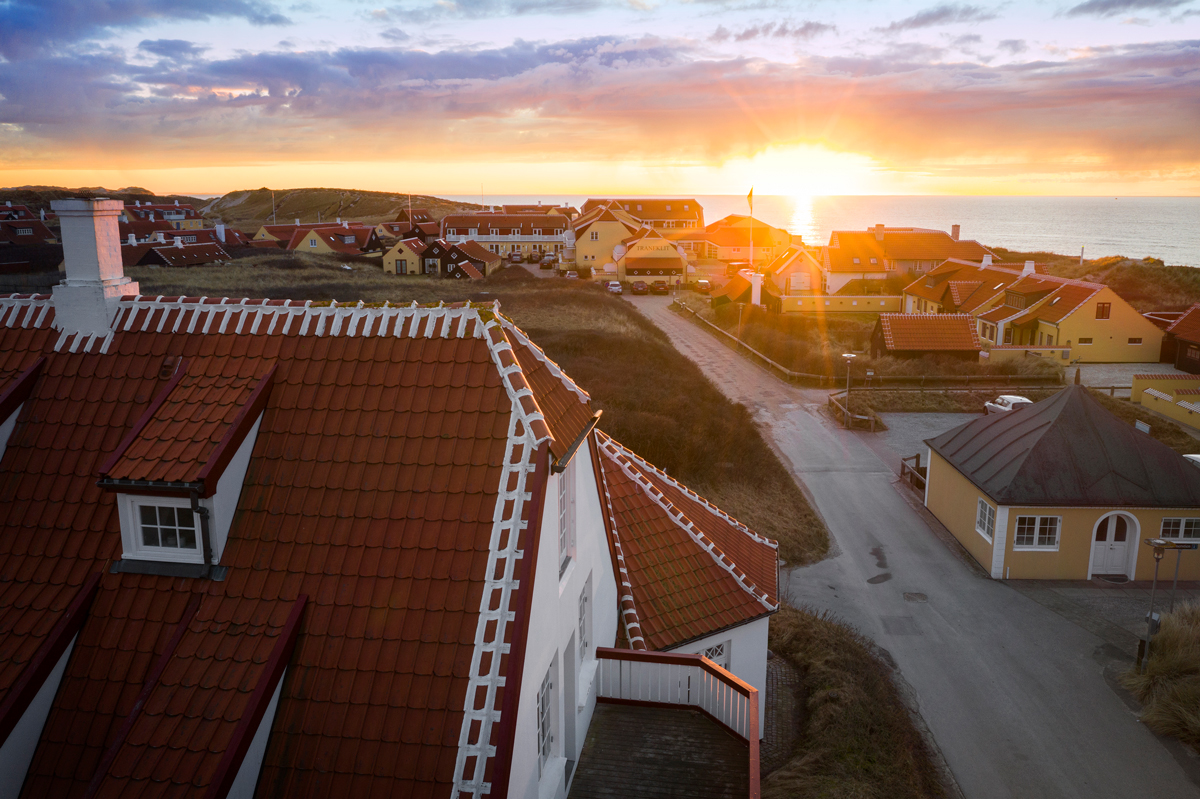 Mod øst ser man hen over Gl. Skagens karakteristiske hustage med unikke gavle og utallige flagstænger, der skyder op i landskabet.