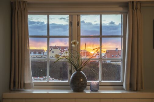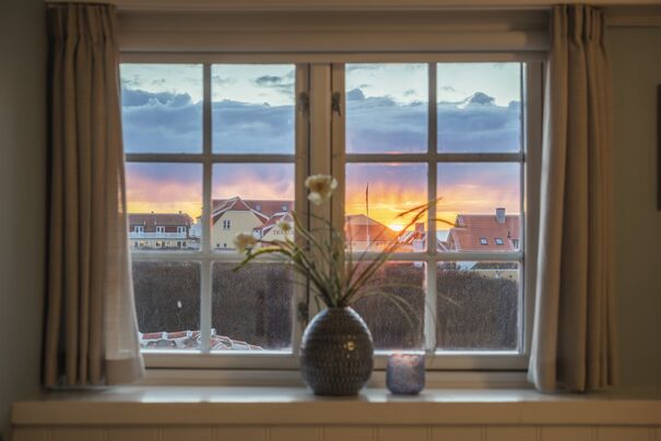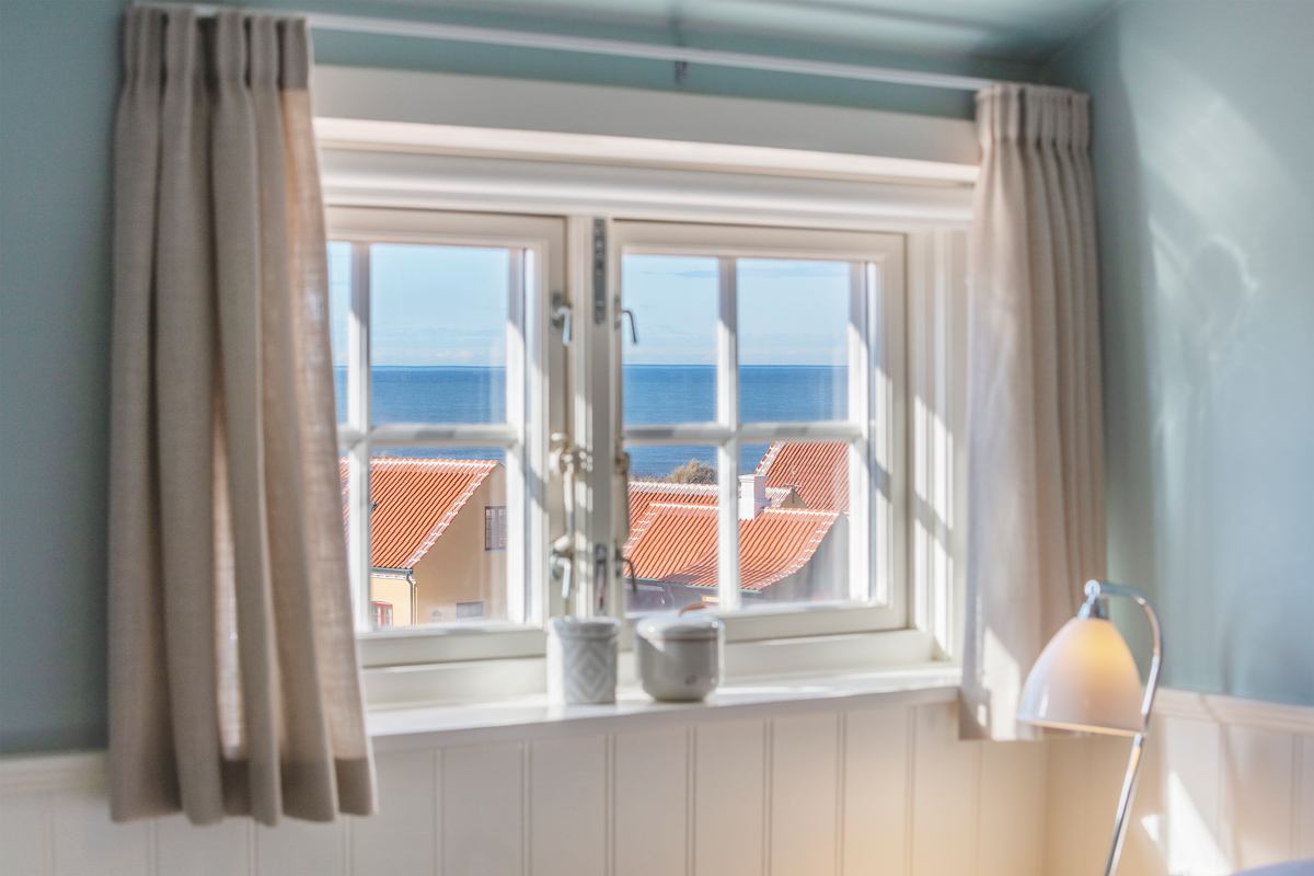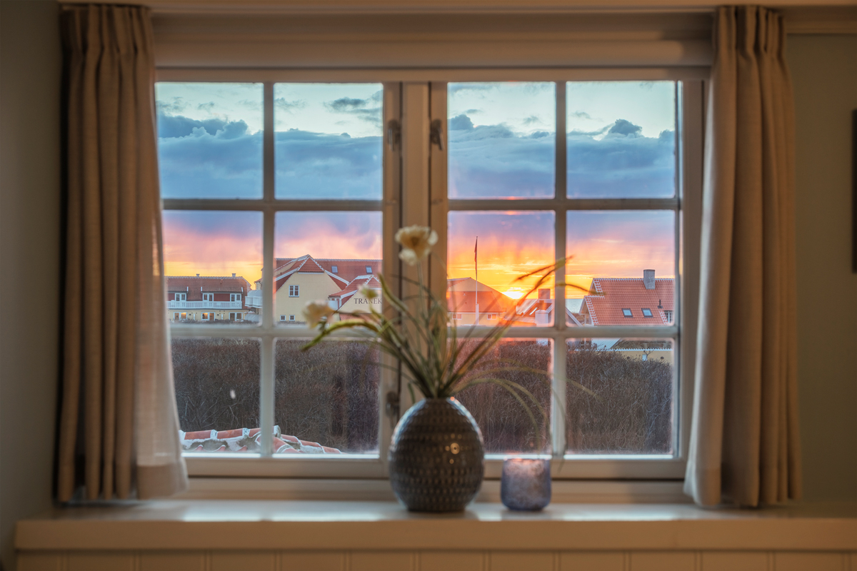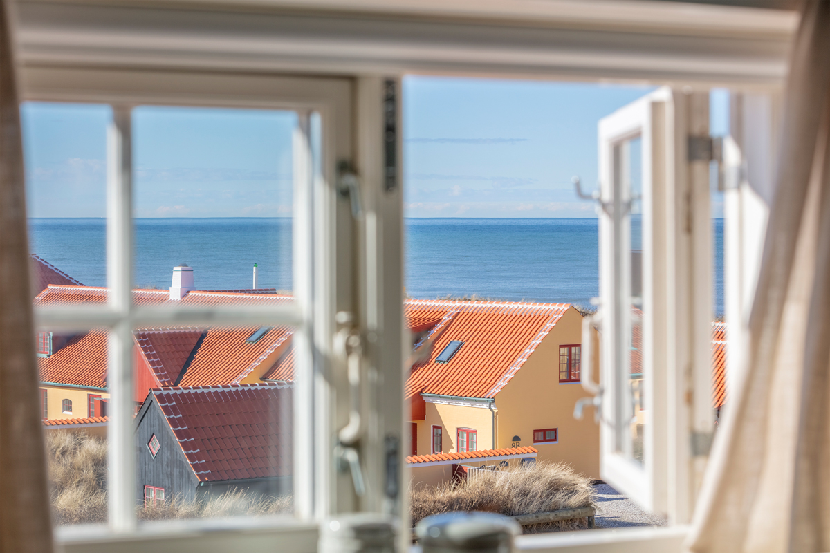 Rettes blikket mod nord, er havet, himlen og horisonten i fuldt panorama, smukt komplimenteret af de røde tegltages hvide kanter og skorstene.