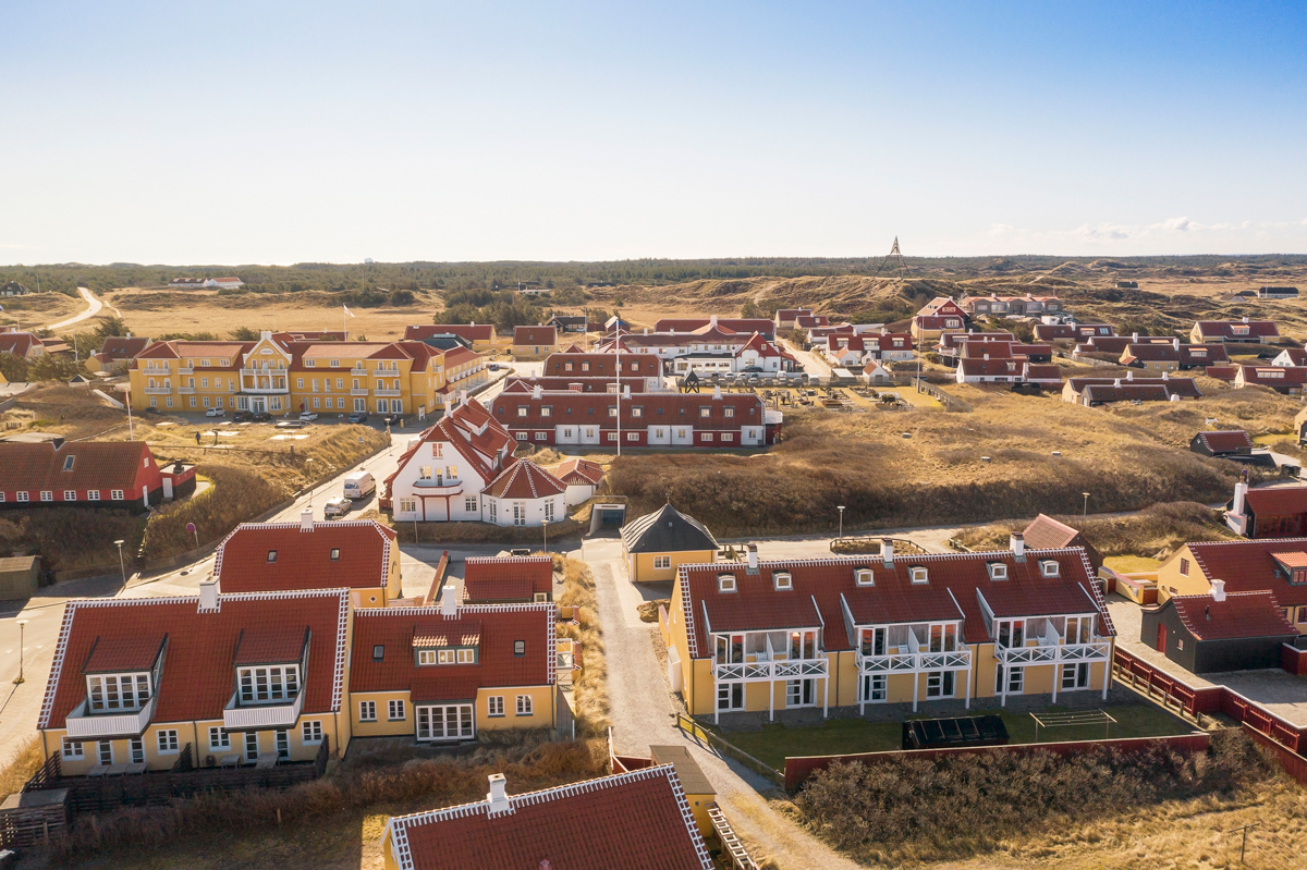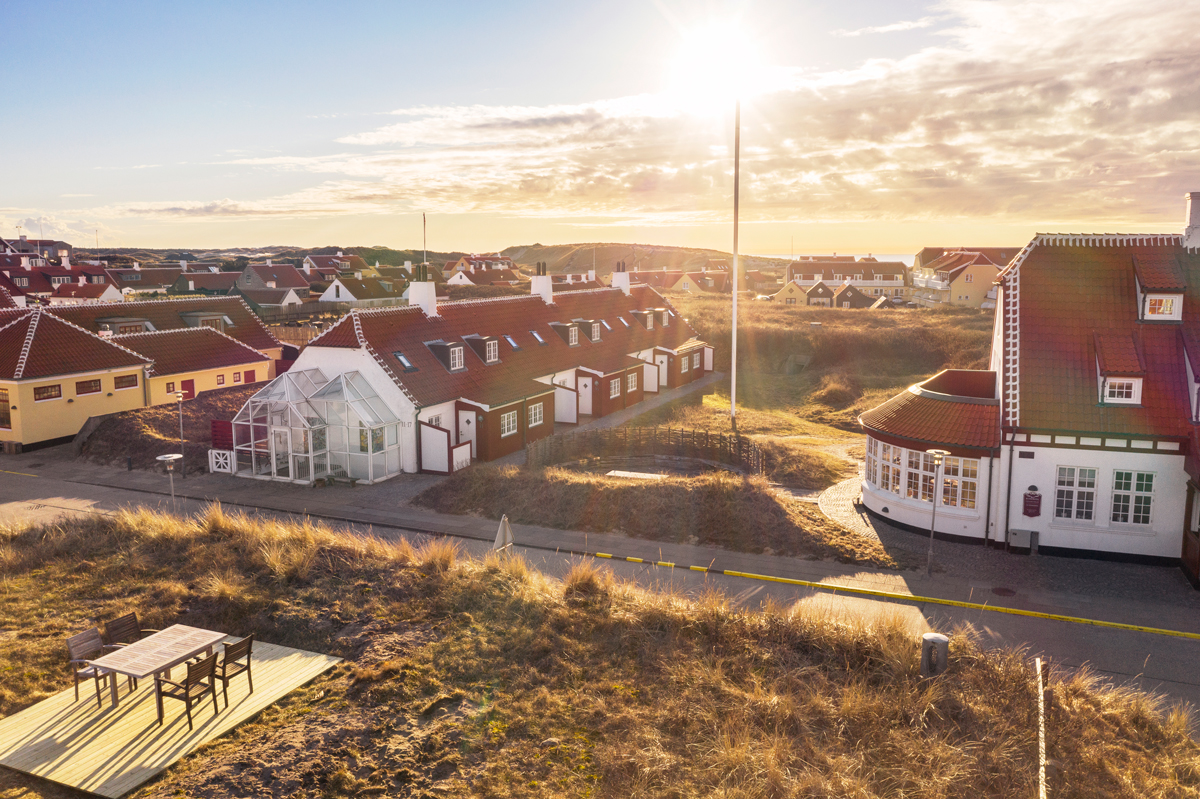 huse er spredt ud i landskabet med de høje klitter i baggrunden.