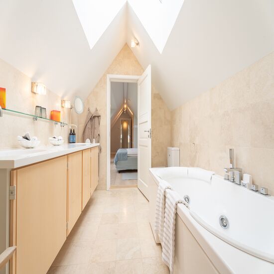 Denne store villa rummer tre soveværelser, tre badeværelser, entré, køkken, opholdsrum samt stue med pejs. Hertil kommer et anneks med eget soveværelse og badeværelse, hvilket giver en samlet kapacitet på op til otte personer.