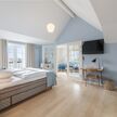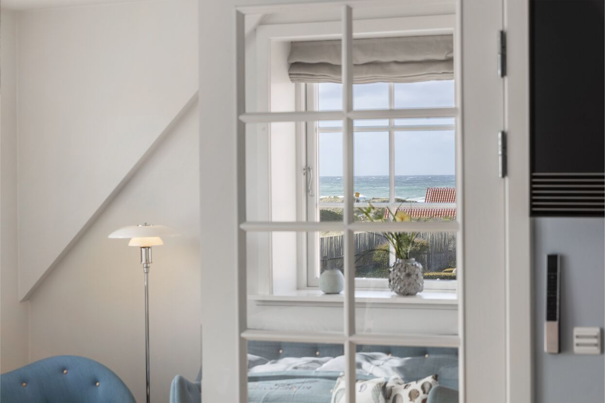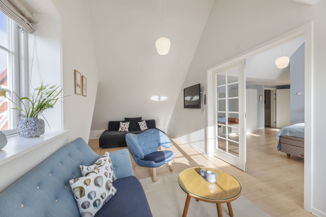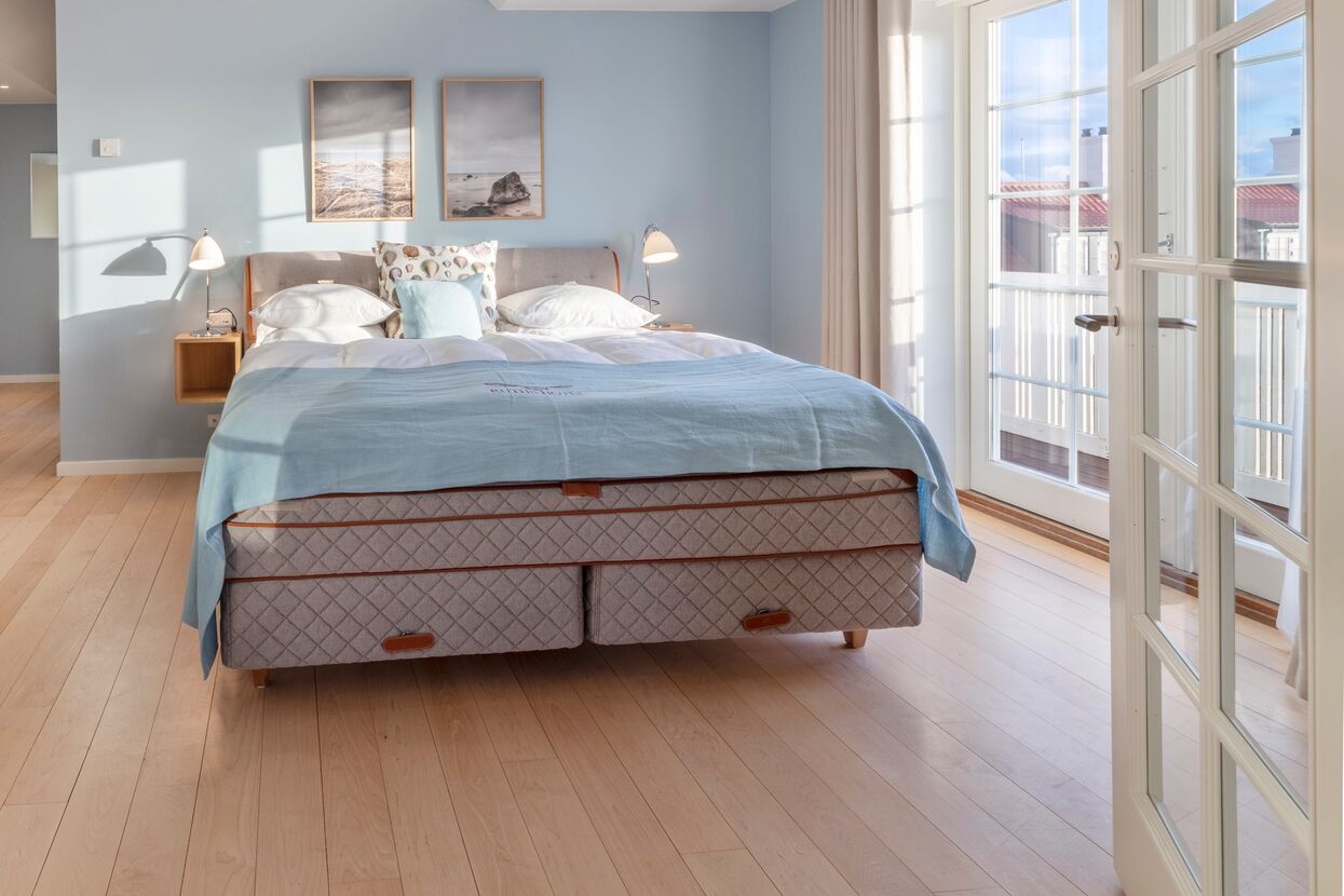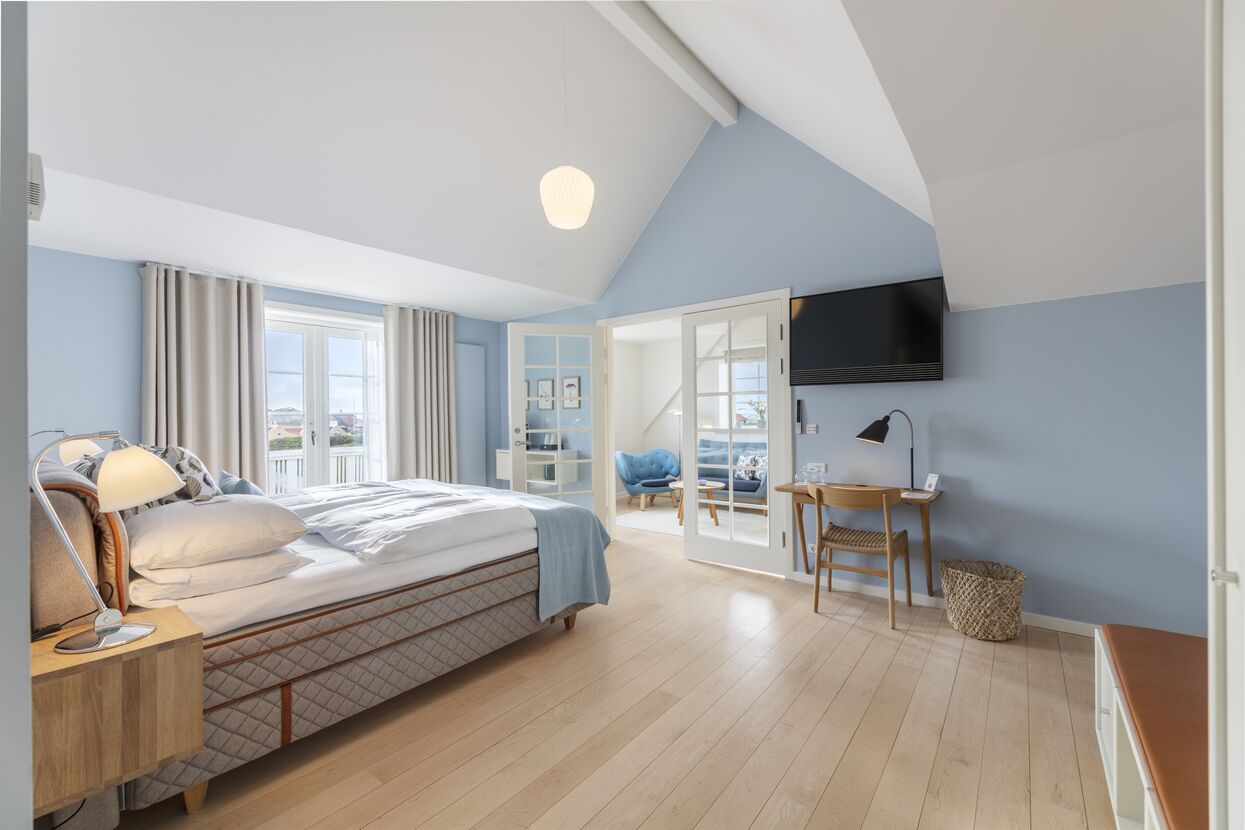 Dagmar-suiten er vores mest eksklusive suite. Der er et skønt badeværelse med badekar såvel som bruseområde. I tillæg til det store soveværelse er der en stue med sofaer og lænestole, hvor der er rig mulighed for afslapning. I alle rum er der desuden udsigt til det idylliske Gl. Skagen. Det samme gælder for den store balkon.