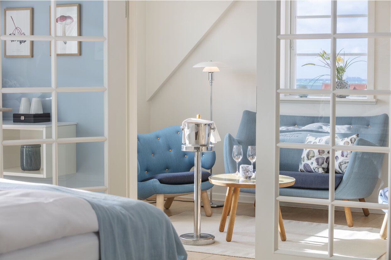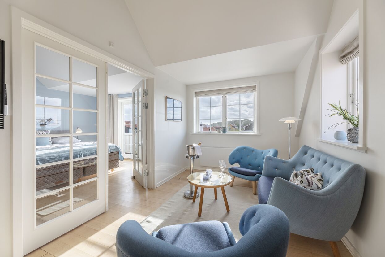 Stilfuldt indrettet med danske designer møbler, B&O musikanlæg og fladskærm er suiten gennemført eksklusivitet for alle sanserne. Med separat stue og soveværelse er det nemt at føle sig hjemme, og trænger I til en romantisk stund, er der plads til 2 personer i badekaret.
