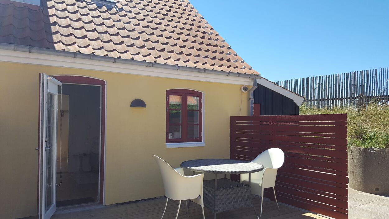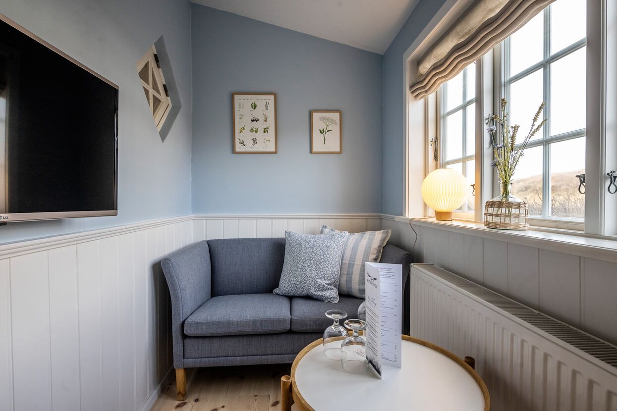 Heraf otte på 1. sal og to i stueetagen med terrasse. Dobbeltværelserne på førstesal har enten udsigt mod nord med udsigt til havet, mod øst indover Gl. Skagen idyllen eller mod syd med udsigt over klitter og marehalm.