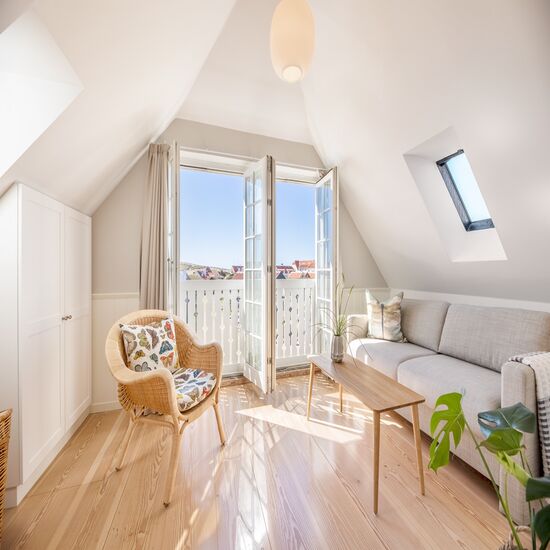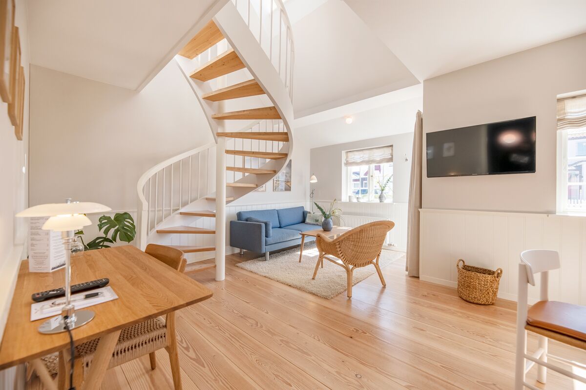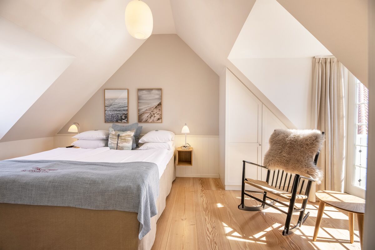 Her tilbyder vi både almindelige dobbeltværelser og lejligheder, som er egnet til, når hele familien er afsted, eller når vennepar ønsker at være sammen på opholdet på Ruths Hotel. Alle værelser i Kunstnerhuset har egen indgang; dobbeltværelserne mod nord og lejlighederne via egen terasse mod syd.